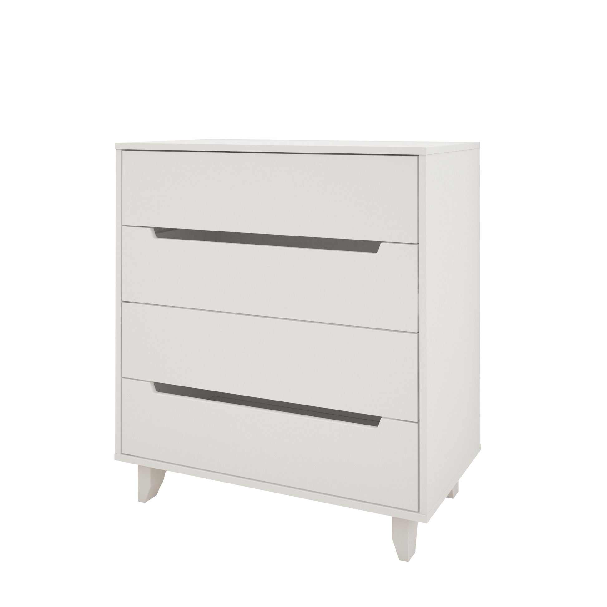 Cette commode à 4 tiroirs est proposée en mélamine blanche avec façades et pieds sculptés en blanc mat. Les lignes modernes sont adoucies par les poignées découpées qui ajoutent du style à tout décor. Elle offre une solution élégante pour ranger vos vêtements et effets personnels.