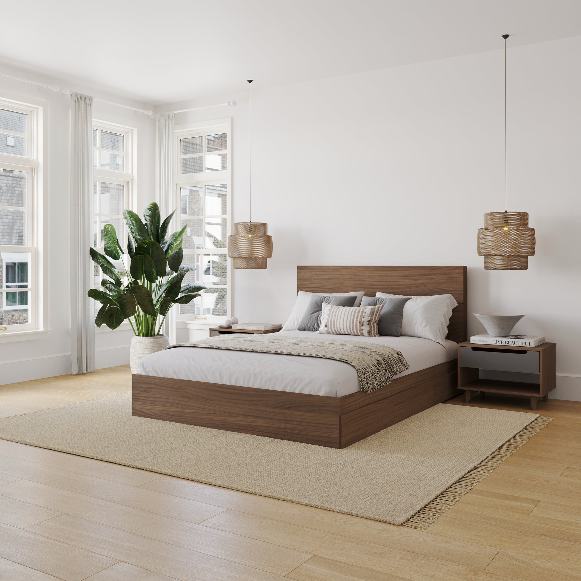 Milo 4-Piece Reversible Storage Bedroom Set comes with a Modern 3 Drawers Storage Platform Bed Frame and a Simple Geometric Panel HeadboardOffering the perfect combination of style and functionality, this sleek platform bed features a modern design paired with a par matching nightstands. While it doesn’t include storage drawers, it is ideal for any size bedroom, providing both stability and longevity. Crafted from high-quality materials, the elegant finish adds a touch of sophistication to your space. Whether you're seeking a contemporary centerpiece or a convenient bedside companion, this collection is designed to meet your needs. No box spring needed—slats are included Assembled Measurement: Full - Front to Back: 79.75 x Side to Side: 103.25 x Highest Point: 40 in. || Assembled Measurement: Queen - Front to Back: 85.5 x Side to Side: 109.25 x Highest Point: 40 in.