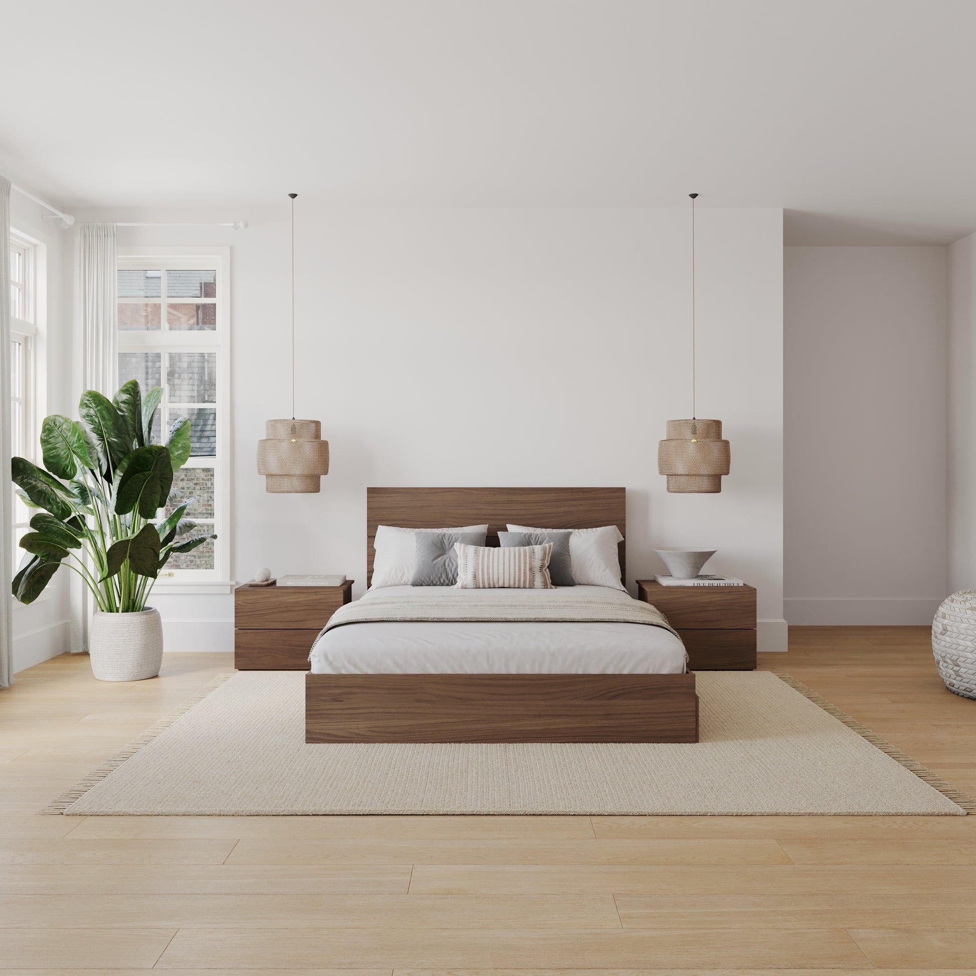 Milo 4-Piece Reversible Storage Bedroom Set comes with a Modern 3 Drawers Storage Platform Bed Frame and a Simple Geometric Panel HeadboardOffering the perfect combination of style and functionality, this sleek platform bed features a modern design paired with a par matching nightstands. While it doesn’t include storage drawers, it is ideal for any size bedroom, providing both stability and longevity. Crafted from high-quality materials, the elegant finish adds a touch of sophistication to your space. Whether you're seeking a contemporary centerpiece or a convenient bedside companion, this collection is designed to meet your needs. No box spring needed—slats are included Assembled Measurement: Full - Front to Back: 79.75 x Side to Side: 103.5 x Highest Point: 40 in. || Assembled Measurement: Queen - Front to Back: 85.5 x Side to Side: 109.5 x Highest Point: 40 in.